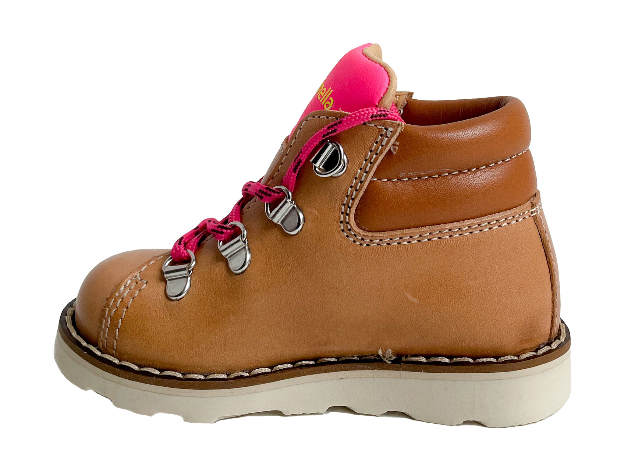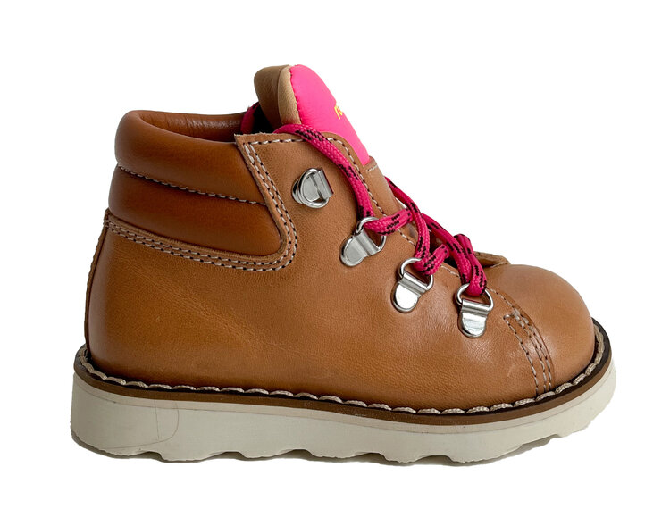 Hoe leuk zijn deze mini bottines van RONDINELLA ?! Ze bestaan volledig uit leder en zijn leder gevoerd. Hier in cognac kleur met fluo roze accent en veters. Stoer en tegelijk girly.