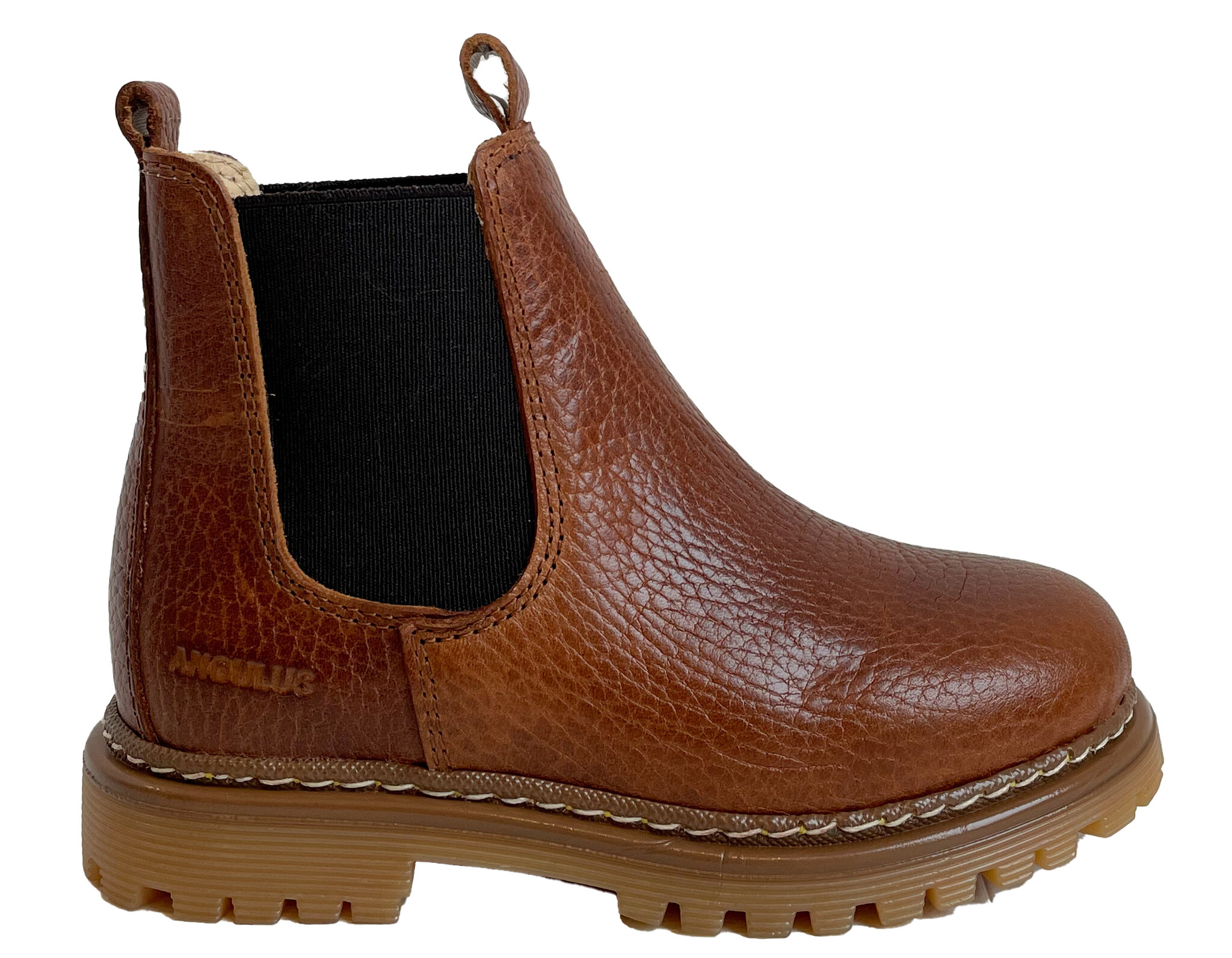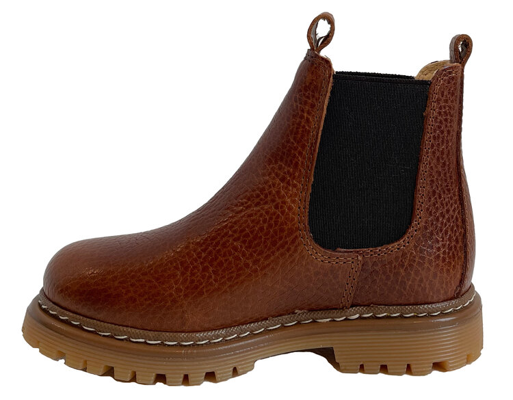 Chelsea boot in cognac. Bestaat volledig uit leder met een dikkere, stoere rubberzool. Heel gemakkelijk aan en uit met de elastieken.