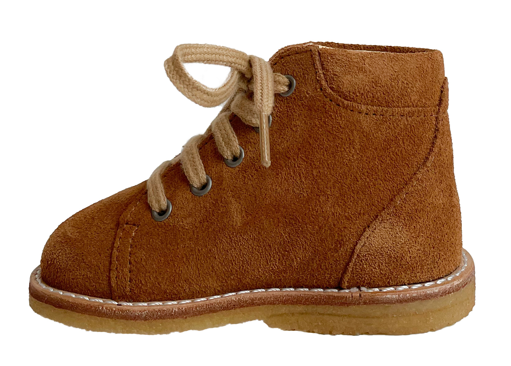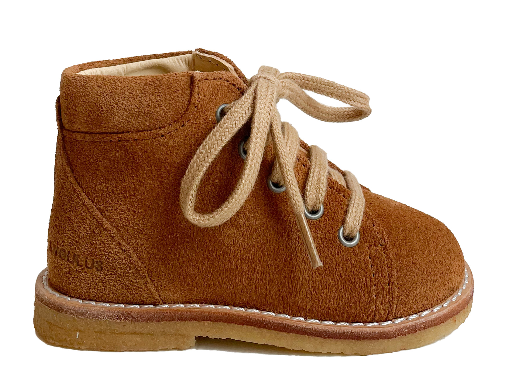 Eerste stapper van ANGULUS in nubuck cognac. Deze schoen is voorzien van veters dat er voor zorgt dat je hem perfect kan aan passen aan de breedte van de voet.