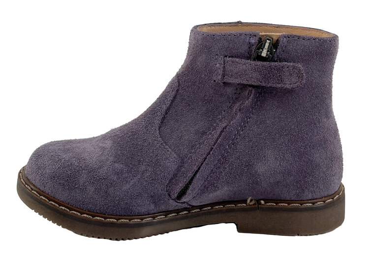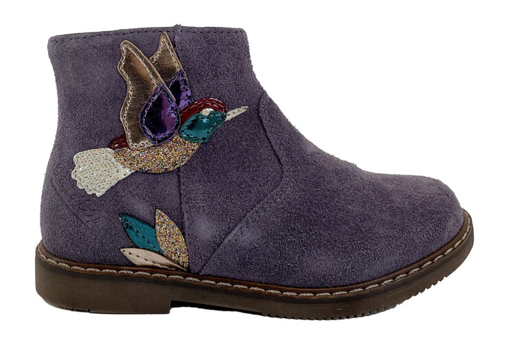 Korte laars in nubuck paars met vogel-detail. Heel gemakkelijk aan en uit met de rits.