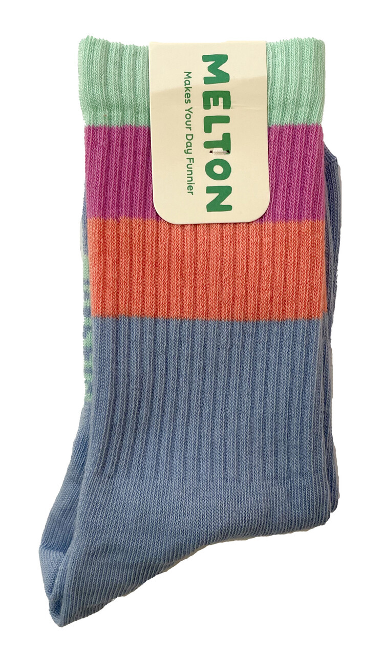 Kous in lichtblauw met oranje, roze, groen