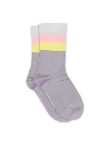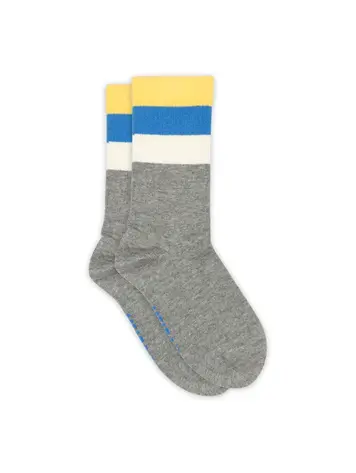 Kous grijs met wit, geel en blauwe streep