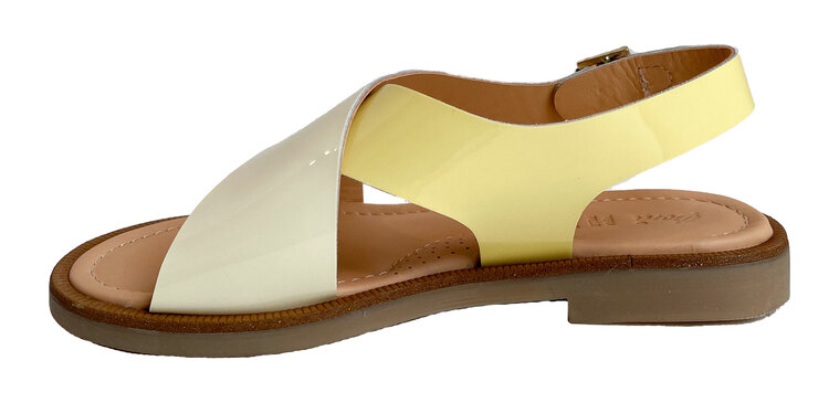 Een klassiek model van Ocra, hier in gekruiste banden lichtgeel en geel lakleder. Deze sandaal zit super comfortabel. Minder geschikt model voor de smalle voeten.