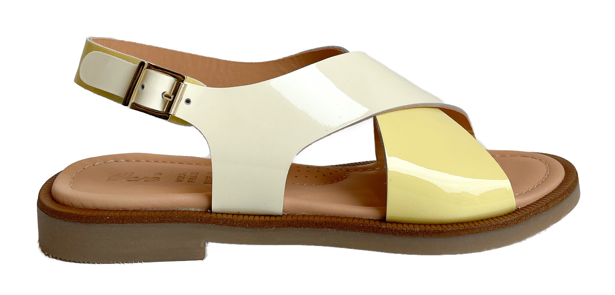 Een klassiek model van Ocra, hier in gekruiste banden lichtgeel en geel lakleder. Deze sandaal zit super comfortabel. Minder geschikt model voor de smalle voeten.