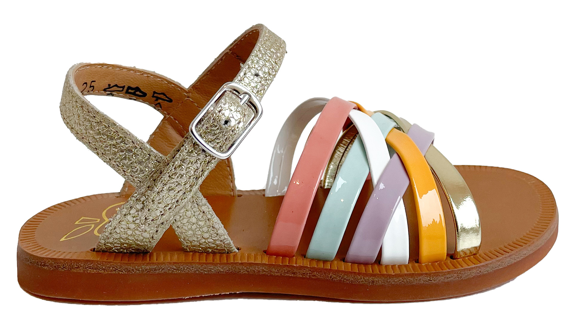 Mooie sandaal in pastelkleurtjes met goud en gesp.