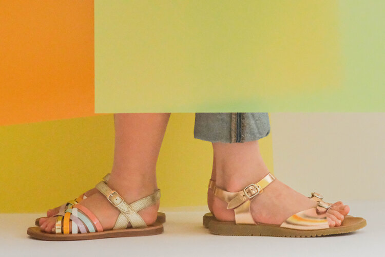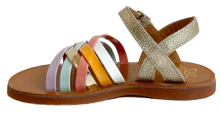 Mooie sandaal in pastelkleurtjes met goud en gesp.