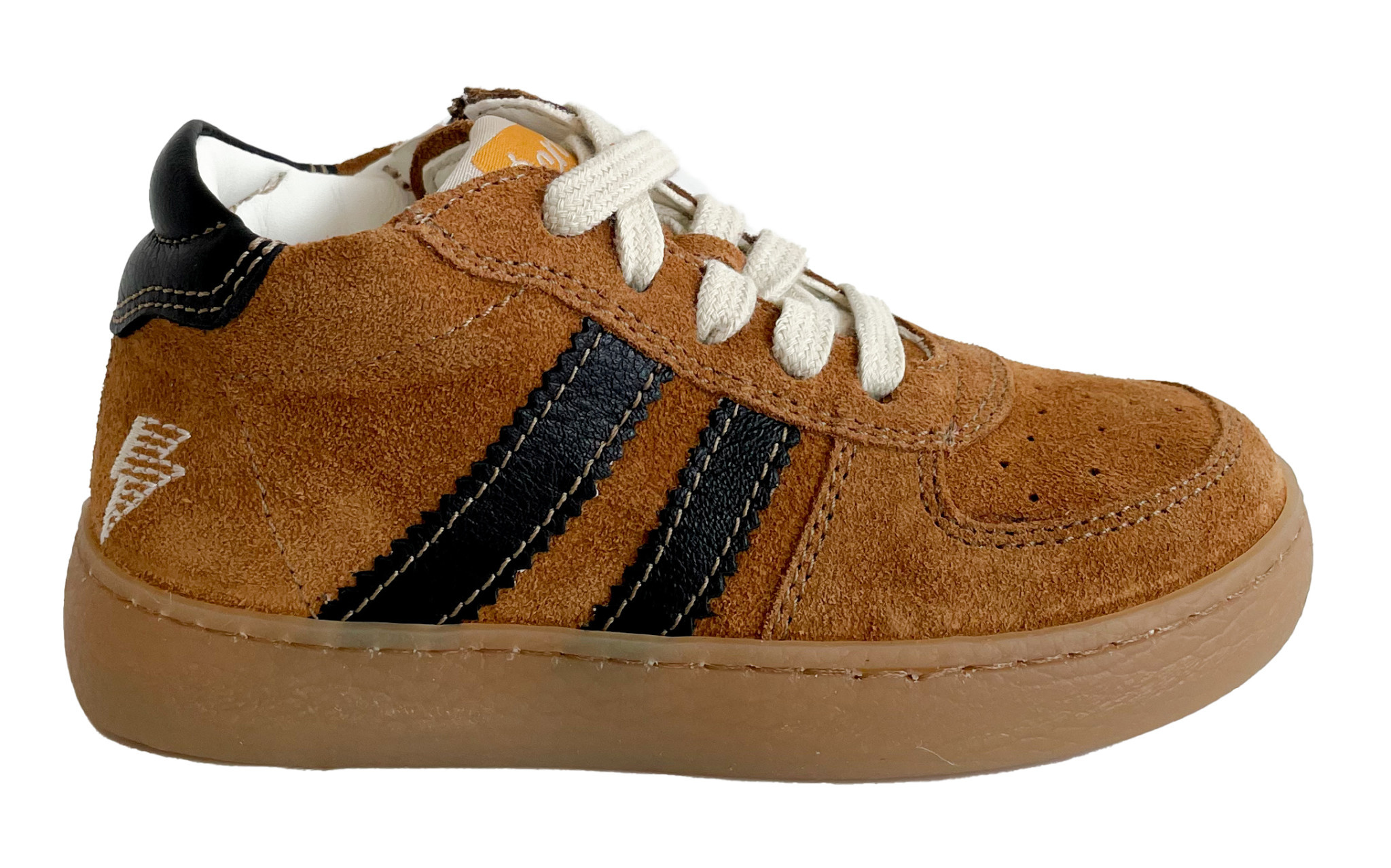 Lederen sneaker in nubuck cognac  met zwart van OCRA.  Volledig in leder vanbuiten en vanbinnen.