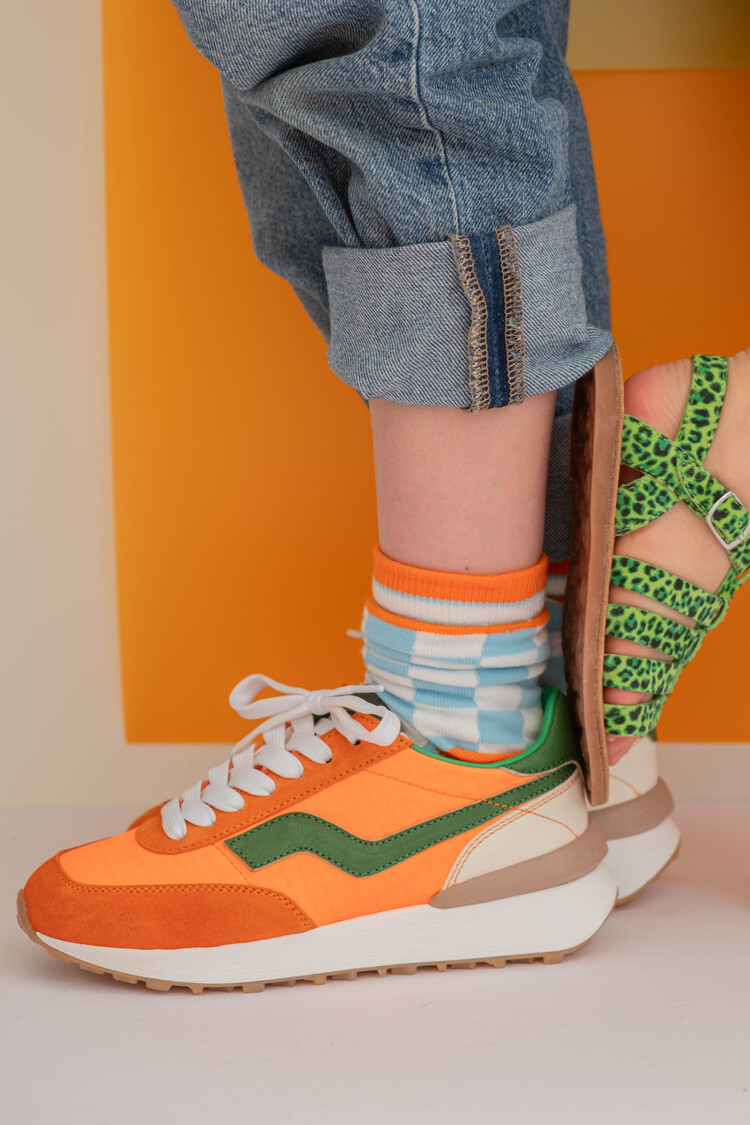 Wat een coole runner?! In fluo oranje met groen accent. Goed aan de passen met de veters en gemakkelijk aan en uit met de rits.