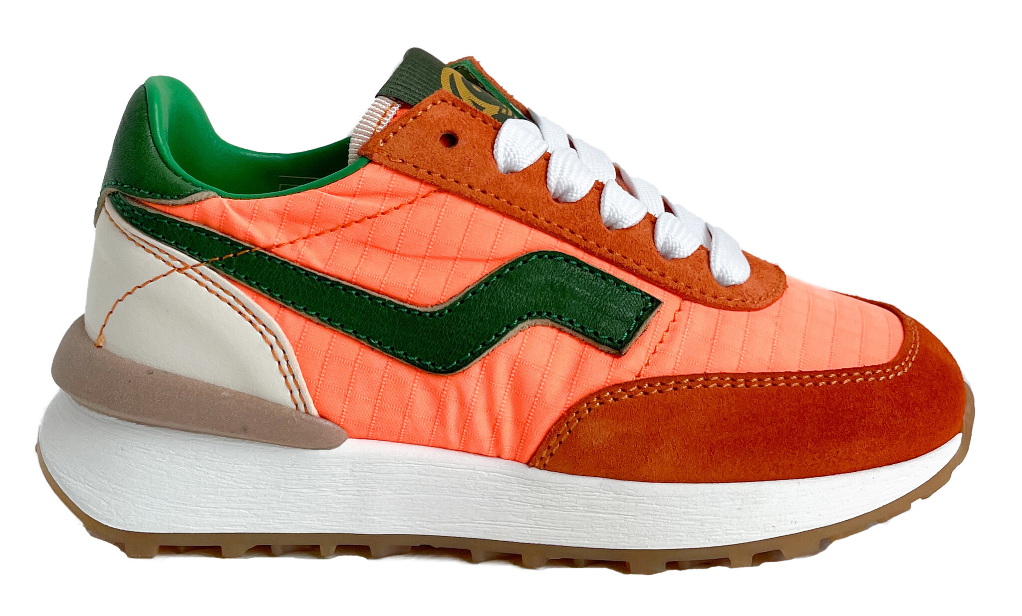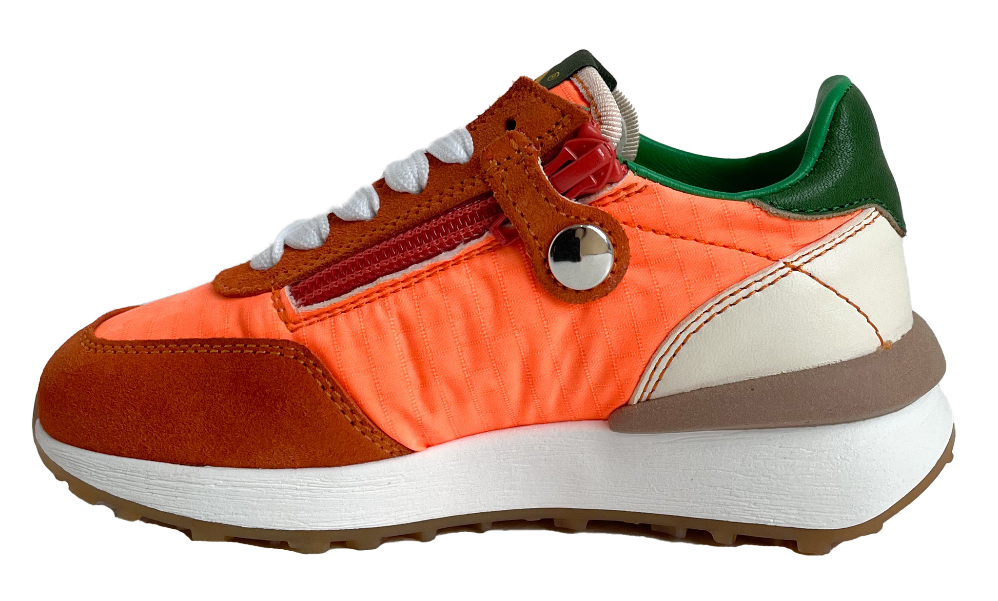 Wat een coole runner?! In fluo oranje met groen accent. Goed aan de passen met de veters en gemakkelijk aan en uit met de rits.